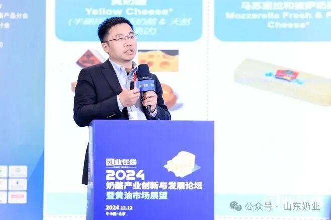图:山东省奶业协会王成武会长受邀参加本次论坛 本次论坛得到了北京多爱特生物技术有限公司、爱氏晨曦乳制品进出口有限公司、北京和润乳制品厂、利乐公司、青岛岛际贸易有限公司、广州德力高进出口贸易有限公司、百施(上海)生物科技有限公司、乐嘉文工业技术(上海)有限公司、上海乐汇实业有限公司、上海恩波露食品有限公司、品渥食品、伯爵咖啡、安德鲁的大力支持。当前,中国乳制品产业深陷低迷行情,国内消费需求与国际供应环境均面临深刻变化,而奶酪成为了调整乳品产业结构的关键,被视为中国乳业新的增长点和突破口。2023年中国奶酪产量约24万吨,市场规模约110亿元人民币,增长潜力巨大。在此背景下,本论坛邀请主管领导、国内外乳品行业组织、研究机构、知名企业负责人,围绕行业趋势展开头脑风暴,与业界同仁分享经验,挖掘合作机会。01